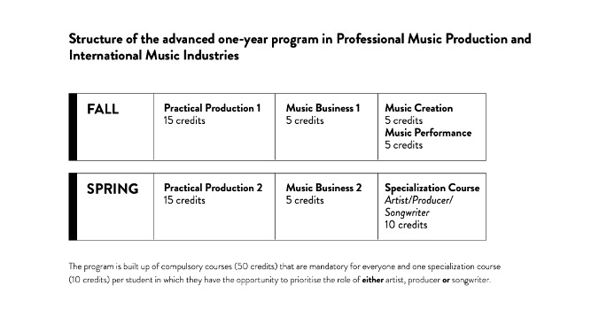 The program is built up of compulsory courses (50 credits) that are mandatory for everyone and one specialization course (10 credits) per student in which they will have the opportunity to prioritise the role of either artist, producer or songwriter.